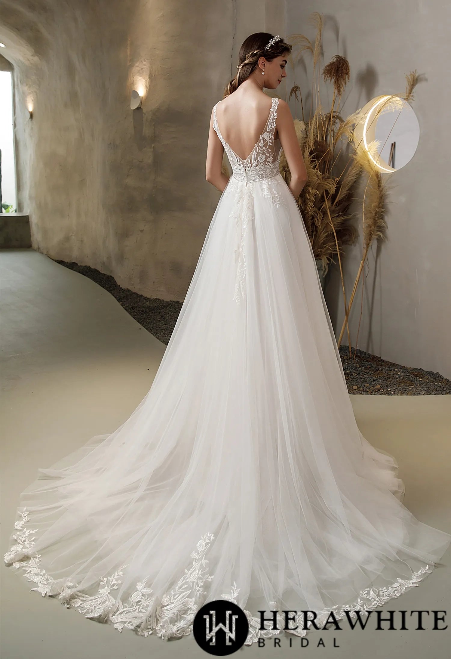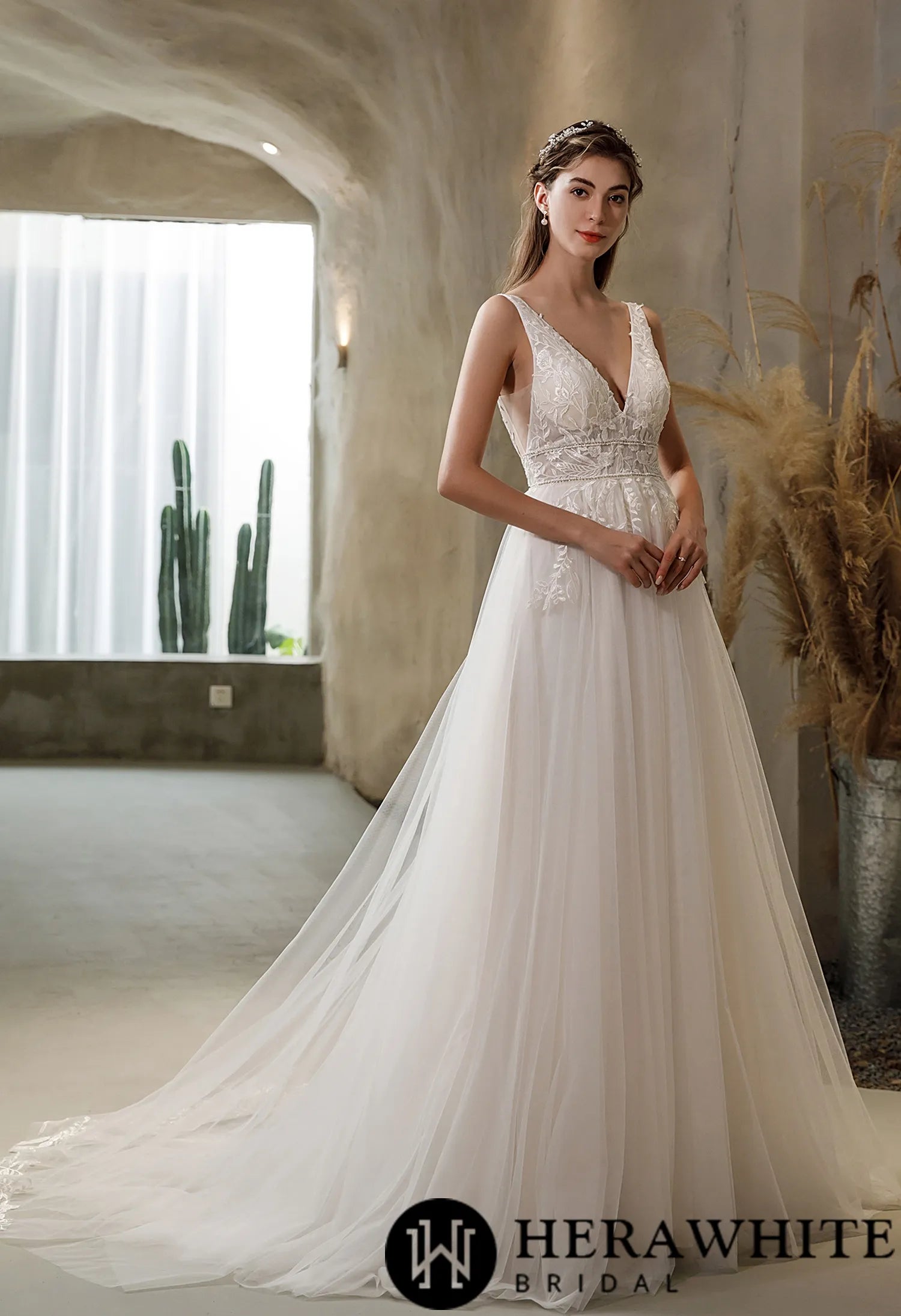 V-neck Tulle Bridal Gown with Double Banded Waist